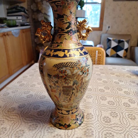 Vaasi, jossa on monivärinen kukka- ja lintukuviointi Satsuma tyylinen. Pohjassa on punainen leima, joka Kiinalainen.