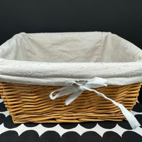 Punottu kori, jossa on valkoinen kangasvuori. Kori on pyöreä ja siinä on tiheä punoskuvio.
