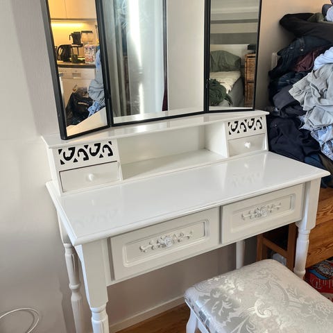 Erittäin hyvässä kunnossa oleva meikkipöytä valolla. Tilattu alunperin HobbyHallista (Hollywood Halmar). Kaksi vetolaatikkoa. Peilin leveys 80cm, pöydän leveys 94cm.