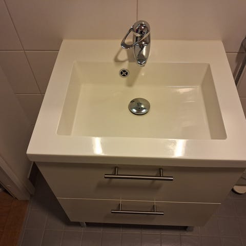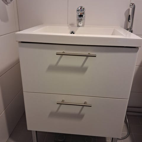 Valkoinen allaskaappi kylpyhuoneeseen. Toisessa päädyssä on kiinnitetty wc-paperiteline.
