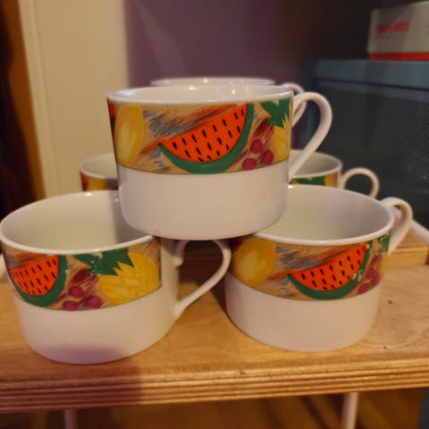 Wilhelm Wakenfeldin suunnittelemat Jena Therm tee/ kahvikupit. Valmistettu Saksassa n 1930- luvulla. 4 kpl kuppi+ lautanen settiä + 1 ylimääräinen lautanen. Kaikki ehjiä ja säröttömiä. Pohjissa leimat. Myydään kaikki yhdessä. Vain nouto Hki Töölö.