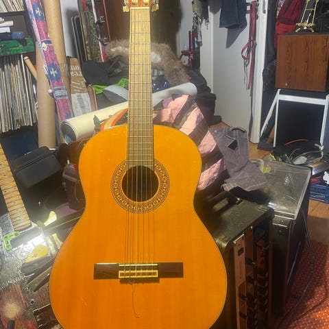 Akustinen klassinen kitara, jossa puunvärinen koppa ja nylonkielet. Mukana pehmustettu kantolaukku säilytystä ja kuljetusta varten. Käsittääkseni 70-luvulla Japanissa valmistettu.
