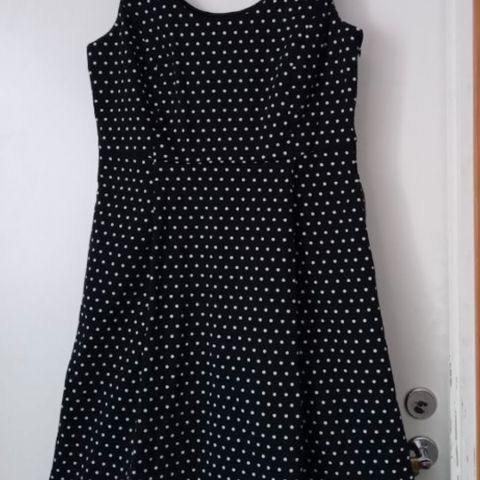 Seppälä musta/valkoinen mekko koko 40. Selässä vetoketju. Hameosassa takana halkio. Kullanvärinen vyö.