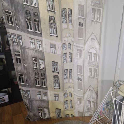 Kankaassa on alhaalla 21 cm käänne joten verhoja voi jatkaa jos on lyhyet.