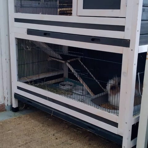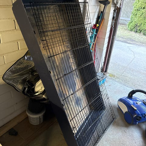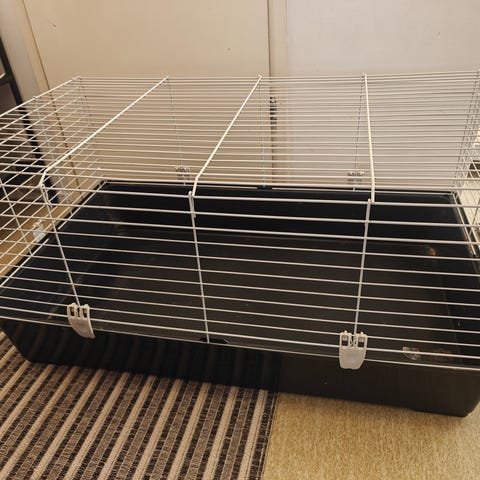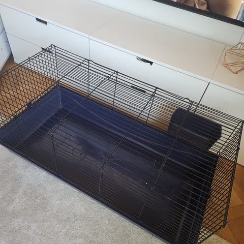 GD Easy 140 kaninhäkki, koko 140 x 69 x 55 cm. Sopinut pienelle kanille. Yksi reunus lohkenut vähän (näkyy kuvassa 3), mutta ei ole vaikuttanut käyttöön. Esteettisiä naarmuja löytyy mutta muuten hyvä kuntoinen. Musta metallinen kalteri-osa saa taiteltua kuljetusta varten. Haku Tilkassa :))))