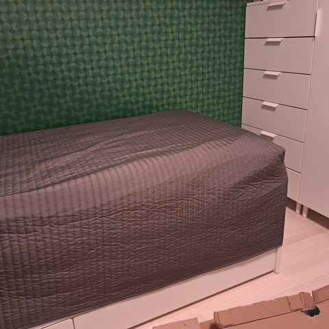 Ellokselta alunperin tilatut päiväpeitto ja kaksi koristetyynynpäällistä. Päiväpeiton koko 260x260 cm ja koristetyynyjen koko 60x60 cm. Sisätyynyt kuuluvat kauppaan, ne ostettu alunperin Ikeasta.