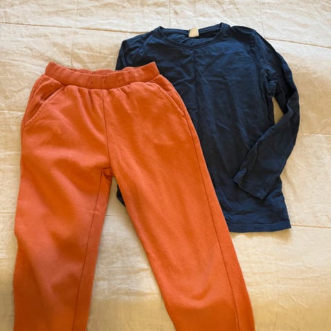 Collegepuserossa toisessa kyynärpäässä pieni reikä, shortseissa pari "ruohotahraa", muuten siistit käyttövaatteet seuraavalle. Shortseissa taskut ja nyöri vyötäröllä.