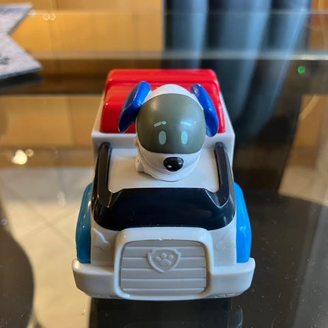 Ryhmä Hau leluajoneuvo ja koirahahmo. Settiin kuuluu pieni valko-sininen auto ja irrotettava koirahahmo, joka voidaan asettaa ajoneuvon kyytiin tai leikkiä erikseen. Muovinen lelu sopii roolileikkeihin ja Ryhmä Hau -sarjan hahmoista pitäville lapsille.