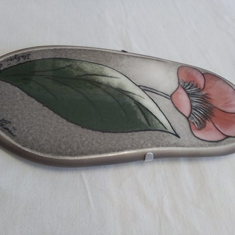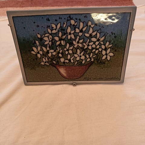 Arabian keraaminen seinälaatta korkeus 32cm ja leveys 13cm,jossa soikea muoto ja kukka-aiheinen koristekuva. Etupuolella on maljakossa olevat kukat, taustasävyinä tummat ja vaaleat ruskean sekä mustan sävyt. Takapuolella on metallinen ripustuskehikko, jonka avulla laatan voi kiinnittää seinälle. Sopii sisustuselementiksi esimerkiksi olohuoneeseen, keittiöön tai eteiseen.