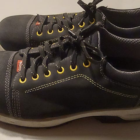 Jalas työjalkine, koko 40. Mustat, kukkakuvioidut kengät, joissa tarrakiinnitys jalkapöydän päällä. Pohjassa kuvioitu kumipohja, jossa oranssit iskunvaimennusosat. Soveltuvat työ- tai arkikäyttöön sisä- ja ulkotiloihin. Vesipestävä +40 °C. Kiinteä, säädettävä kantaremmi. Vaihdettava iskunvaimennuspohjallinen.