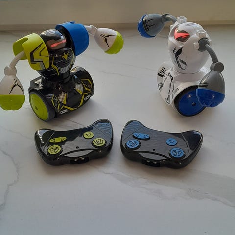 Robo Kombat taistelurobotit taistelevat toisiaan vastaan. 2 kpl ja molemmille kaukosäätimet. Juuri patterit vaihdettu. Roboteilta on kadonnut olkapäistä muoviset osat jotka oli koristeena. Ääni ja valoefektit, korkeus 13 cm ikäsuositus yli 5 vuotiaille.