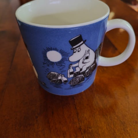 Tummansininen muumimuki ysäriltä. Korvaton. Pinnassa pieniä valkoisia pisteitä, koitin nämä saada kuvattua. (Huom. pidemmät ”viivat” ovat heijasteita valosta🙂)