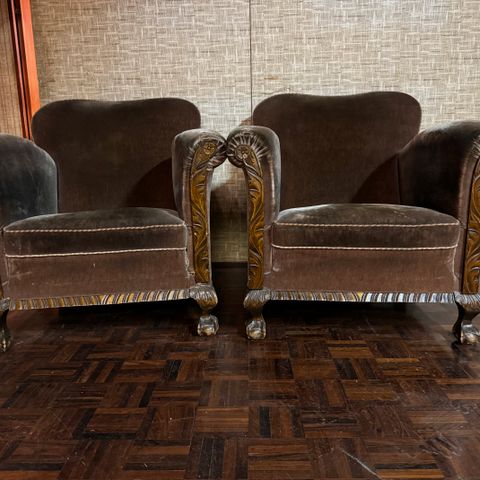 Rokokoo tyylinen nojatuoli. Puuosien lakkapinta on hieman kulunut / hilseillyt, muuten tukevat ja siistit. Istuinkorkeus n. 47cm. Myynnissä 2 kpl. 35€ kpl.