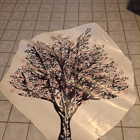 Puuaiheinen seinätarra, jossa on harmaa runko ja oksat sekä lehdet. Tarran taustalla on suojapaperi, joka poistetaan ennen kiinnitystä. Tarran koko leveys 80cm ja korkeus 91cm.