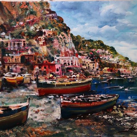 Öljy taululle kankaalle 24 x 30 cm, mestari Salvatore Montella (1949), Napolissa syntynyt taiteilija, jolla on sekä kansallinen että kansainvälinen asema. Hänen teoksiaan on esillä sekä Italiassa että ulkomailla. Tunnettu Napolin tyypillisten kujien maalari ja ei vain siitä. Kuvattu on tyypillinen kansanomainen kohtaus: Napoli- markkinapöhinä (kansanomainen kohtaus Napolissa) with multiple characters. Todella kaunis teos. Mestari kuvaa upeasti Napolin ominaisia kansankuvia. Pakkaus suoritetaan turvallisesti ja ammattitaidolla. Huomataan erinomainen maalaustaito. Takakannella taiteilijan allekirjoitus. Lähde: yksityiskokoelma ja toimitus on seurattavissa.