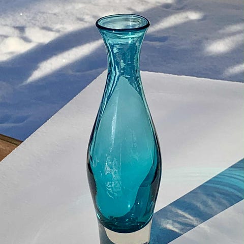 Aimo Okkolin Riihimäen Lasille suunnittelema turkoosi 'Nimipäivä'-sarjan lasimaljakko.
