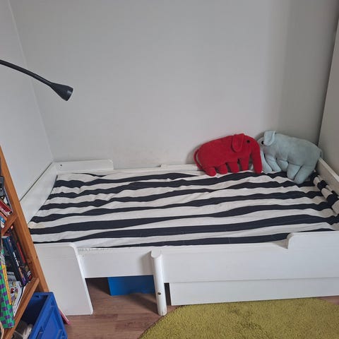 Muurame juniorisänky. Valkoinen lasten juniorisänky, jossa puunväriset reunalistat. Sopii lapselle siirtymävaiheeseen pinnasängystä isompaan sänkyyn. Kuvissa näkyy käytön jälkiä ja kulumaa reunoissa, muuten oikein hyvä ja vankka sänky seuraavalle lapselle!