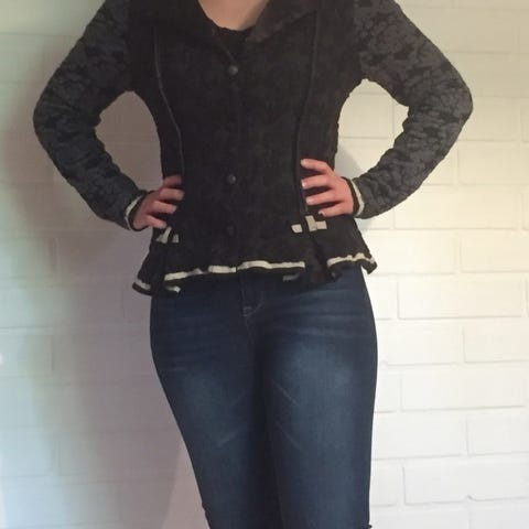 Toba&co paris todella hyväkuntoinen, pari kertaa pidetty musta / harmaa avoin neuletakki hapsuilla.