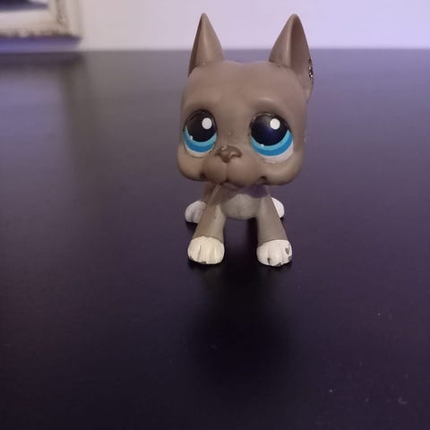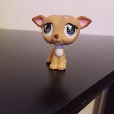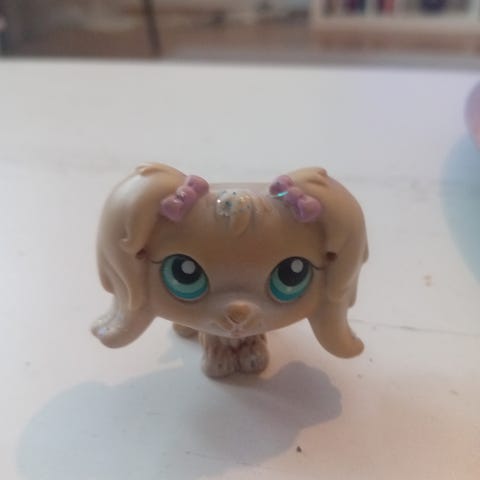 Littlest Pet Shop -koirafiguuri. Pieni ruskea muovinen koira, jolla on vihreät silmät ja pitkät korvat. Sopii leikkeihin tai kokoelmaan. Koko noin muutamia senttimetrejä korkea. Mukana myös petsitarvikkeita. Nouto Matinkylästä ja maksu käteisellä