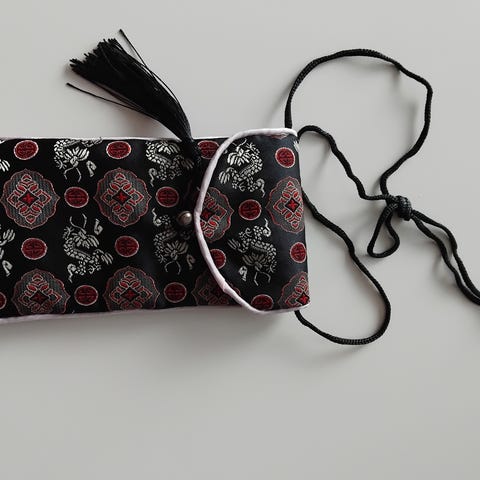 Reilunkokoinen Seppälän kangaskukkaro/ -pussukka. Kuosissa valkoiset pienet pääkallosomisteet. Lähes uudenveroisessa kunnossa.