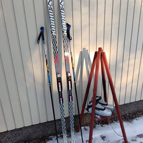 Maastohiihtosetti, johon kuuluu hyväkuntoiset Salomonin rc-carbon perinteisen hiihtotavan monot kokoa 45 1/3 (sns-siteisiin sopivat) sekä Karhu Volcan perinteisen sukset Salomon SNS-propulse -siteillä. Suksen pituus 197 cm, sopivat noin 70-80 -kiloiselle hiihtäjälle.
