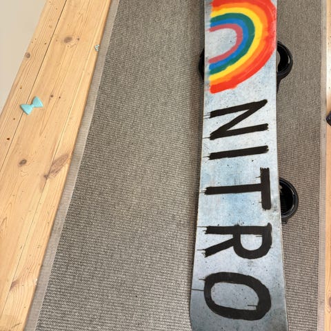 Nitro lumilauta siteillä. Laudassa on värikäs sinisen, keltaisen ja ruskean sävyinen kuvitus. Siteet ovat säädettävät ja väriltään kelta-vihreät. Hyväkuntoinen, Nitro Demand 138, vähän laskettu lumilauta Nitro Charger siteineen.