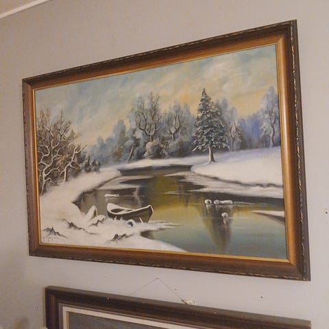 Talvinen jokimaisema -aiheinen öljyvärimaalaus. Teoksessa on kuvattuna luminen jokiranta, virtaava joki sekä taustalla taloja ja puita. Maalaus on vaakasuuntainen ja kehystetty. Sopii käytettäväksi seinätauluna sisustuksessa esimerkiksi olohuoneessa, makuuhuoneessa tai työtilassa.