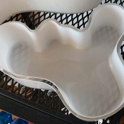 Käytössä ollut valkoinen, iso signeerattu Aalto tarjoiluvati 80-luvulta, signeeraus Alvar Aalto 344/1987 (kuva). Iittalatarra jäljellä. Leveimmillään 38 cm x 27 cm. Reunan korkeus 5 cm. Reunassa pitkin matkaa kirppuja, riskuja, kuvissa näkyy jotain. Nouto Vuosaari, Helsinki.