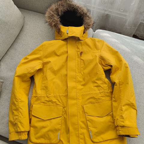Hyväkuntoinen, ehjä toppatakki kirjavan sininen irrotettavalla hupulla edessä kokopitkä vetoketju sivuilla vetoketju taskut. Materiaali on vettä sekä tuulta pitävää materiaalia.