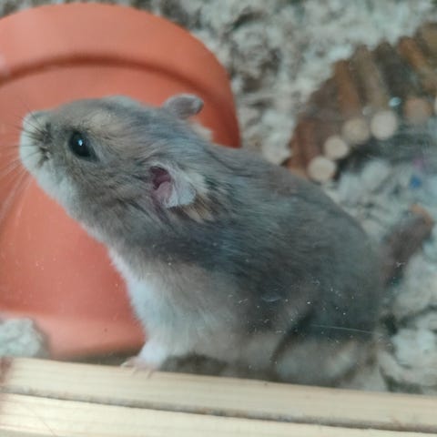 Nykyinen isäntä hanki hänet syntymäpäivälleen, mutta nyt lähtee opiskelemaan ja hamsteri väliaikaisesti on jäänyt meille.