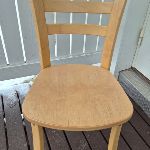 Tummalla massiivipuurungolla ja vaalealla kangaspäälysteisellä istuinosalla 4 kpl hyväkuntoisia ruokapöydäntuoleja, pieniä käytönjälkiä löytyy. Kokonaiskorkeus 87cm, istuinkorkeus 45 cm ja leveys 42 cm