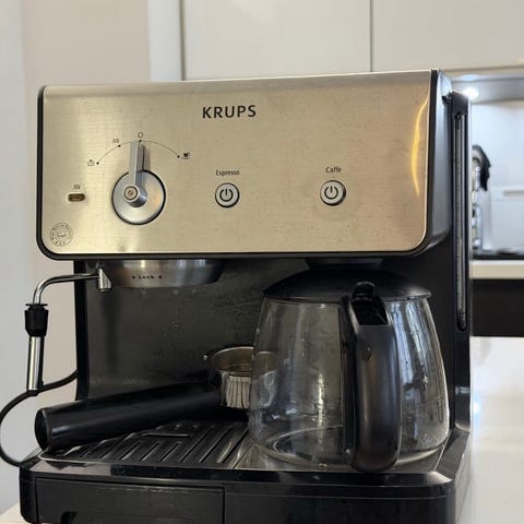 Krups espressokeitin kotikäyttöön. Laite on musta ja siinä on metallinen tipparitilä sekä erillinen höyrysuutin maidon vaahdottamiseen. Edessä on käyttökytkimet ja merkkivalot.
