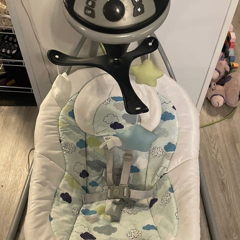 Ingenuityn koliikkikeinu, käytetty mutta hyvässä kunnossa. Värinätoiminto, musiikki, luontoäänet ja lelukaari väriä vaihtavilla valoilla.