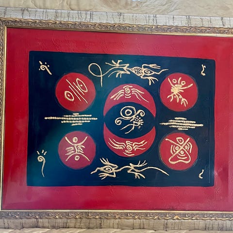 Teoksessa on orgaanisia, pyöristettyjä muotoja, joita rajaa kullanvärinen viivasto tummalla taustalla.