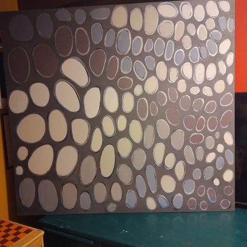 Abstrakti maalaus, toteutettu sekaväritekniikalla kankaalle.