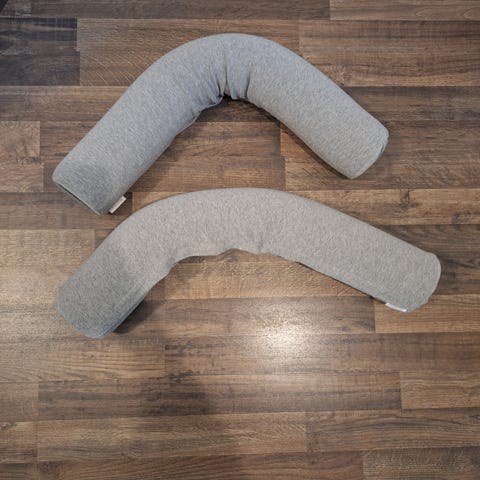 U-mallinen niskatyyny harmaalla päällisellä. Tyyny on tarkoitettu niskan tukemiseen esimerkiksi matkustaessa tai levätessä istuma-asennossa. Päällinen on vetoketjullinen, joten sen voi irrottaa pesua varten. Kahdessa kohdassa on repeämä, Sopii käytettäväksi aikuisille ja nuorille niskan tukityynynä. Repeämät saa ommeltua varmasti.
