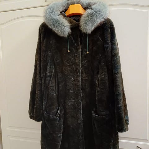 Musta minkkistoola. Tehty pitkän minkkiturkin helmasta. Yläreunanpituus 148cm, alareunan pituus 166cm, korkeus 43cm. Istuu mukavasti harteille, koska reunat ovat eri pituisia. Kuvassa näkyy huolitellut reunat ja laadukas vuori.