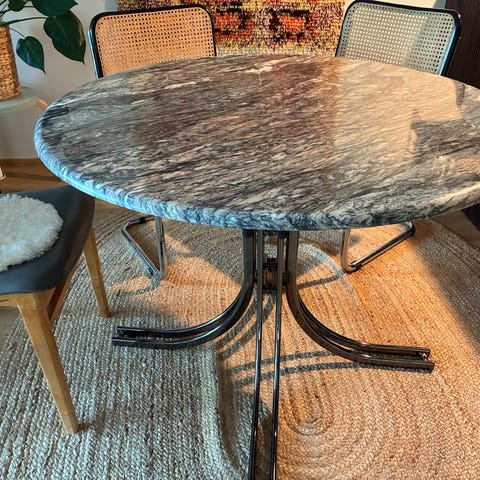 Muuten loistavassa kunnossa olevat graniitti pöytä ja tuolit, mutta pöydän jalasta maalit irronneet (kuvat). Ostettu vekestä. 105cm halkaisija. Tuolit mustat nahkaiset ehjät mutta jotain normaalia käytönjälkeä varmasti.