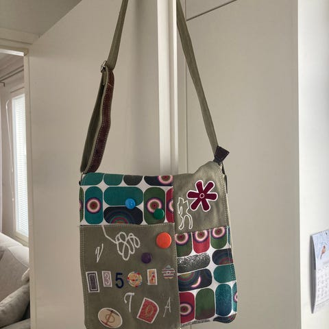 Käsintehty monivärinen tilava olkalaukku laadukkaista materiaaleista