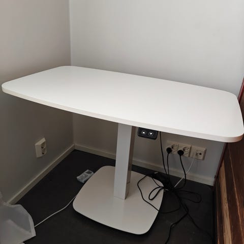 Laadukas ja jämäkkä valkoinen Lykke sähköpöytä, jossa suorakulmainen kansi pyöristetyillä kulmilla. Metalliset valkoiset T-jalat. Pöydässä on sähköinen korkeudensäätö asennettuna vasempaan reunaan, voi vaihtaa ruuvaamalla oikeaan reunaa. Kannen alla pidike sähköjohdolle. Säätyy portaattomasti 71-121 cm välillä.