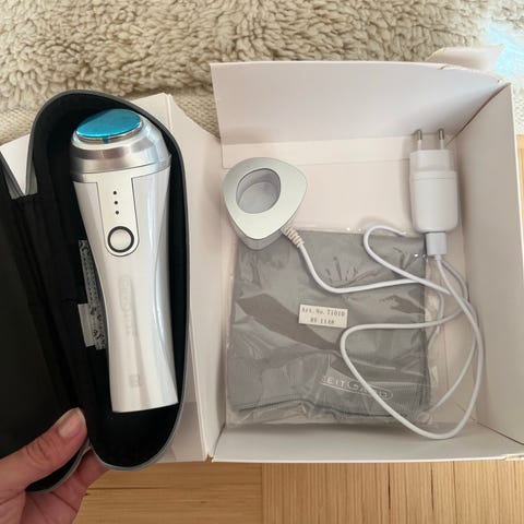 LightStim for Acne led-valohoitolaite akneiholle. Laite on käsikäyttöinen ja siinä on useita pieniä led-valoja hoitopäätä varten. Mukana tulee virtajohto ja verkkolaite, suojalasit, käyttöohje sekä vetoketjullinen säilytyskotelo. Väri on valkoinen. Soveltuu kasvojen ja muiden ihoalueiden paikalliseen valohoitoon valmistajan ohjeiden mukaisesti. Toimii täysin hyvin. Mukaan tulee kuvassa näkyvä verkkovirta adapteri