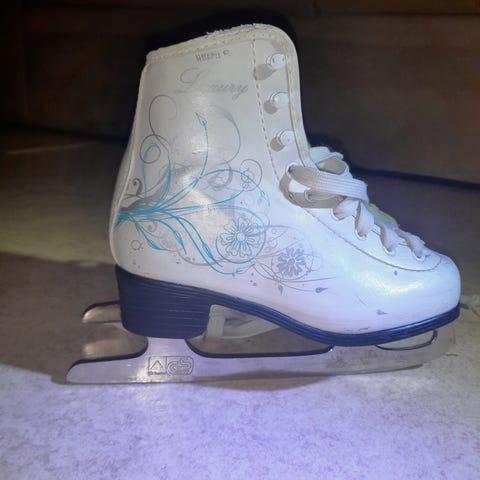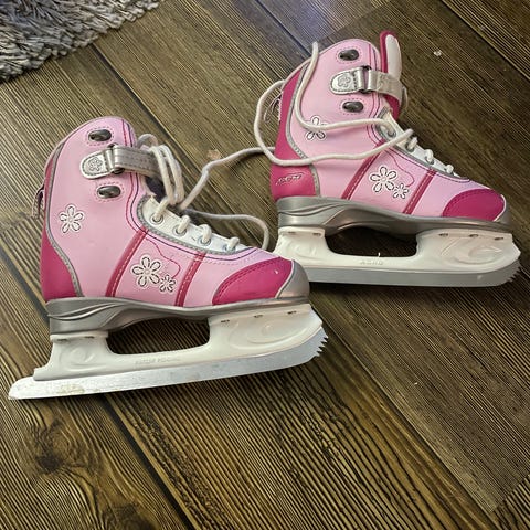 CCM lasten luistimet, koko 34. Väriltään pääosin pinkit valkoisilla ja fuksian sävyisillä yksityiskohdilla sekä kukkakoristeilla. Luistimissa on nauhat ja tarrakiinnitys varmistamassa istuvuuden. Terien kärkipiikit hiottu pois.