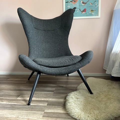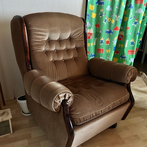 Harmaa kangasverhoiltu nojatuoli, jossa on taitettava vuodemekanismi. Tuolin istuinosa voidaan vetää esiin, jolloin nojatuoli muuttuu suoraksi makuualustaksi. Sopii esimerkiksi olohuoneeseen tai vierasvuoteeksi. Verhoilu on yksivärinen ja käsinojat ovat leveät ja pyöristetyt. Tuolin runko näyttää olevan pehmustettu kauttaaltaan mukavaa istumista ja lepäämistä varten.