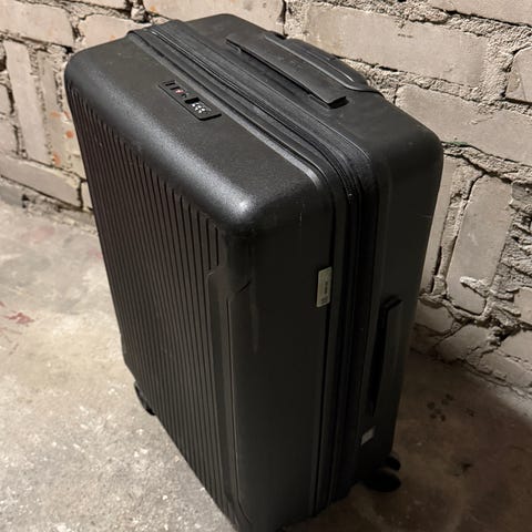 Musta kovamuovinen matkalaukku, kahdella pyörällä. Laukkuun saa kätevästi enemmän tavaraa avaamalla lisävetoketjun.