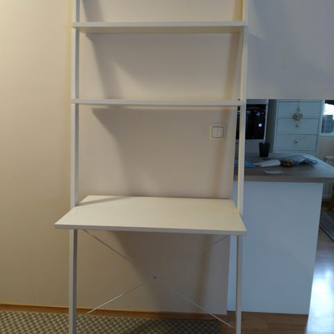 Valkoinen seinään kiinnitettävä avattava työtaso / työpöytä / etätyöpiste / koulupöytä / kaappi. Kaasujouset, Sisäkannessa käytön jälkiä, muutoin hyvä kunto. Nouto Tapanilan aseman läheltä.