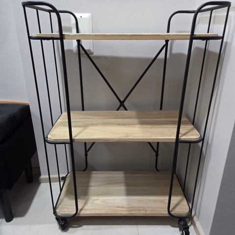 Myydään musta metallinen hyllykkö, joka on jäänyt ylimääräiseksi, kunto on hyvä.