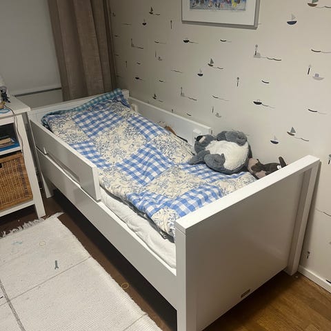 Lapsen käytössä ollut Avaroom juniorsänky 65x160cm (patjan koko). Pinnassa elämisen merkkejä, mutta menee vielä hyvin seuraavalle. Lelulaatikko sekä patja mukana.