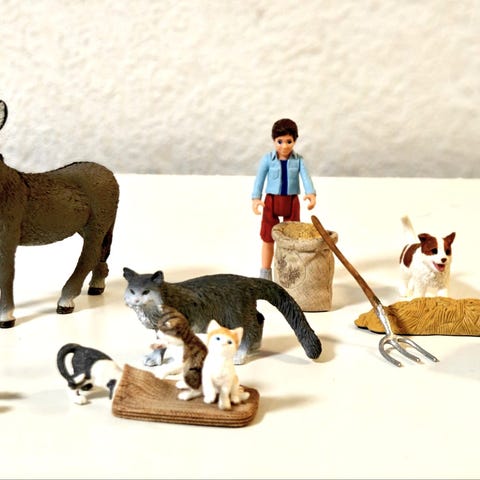 Schleich leikkisetin tarvikkeet. Kuvissa erilaisia muovisia lisäosia, kuten lapioita, haravia, harjoja, aitoja, seimiä, laatikoita, koreja, paaleja ja vihanneksia. Sopii Schleich-leikkimaailmoihin, esimerkiksi maatila- tai tallileikkeihin. Kaikki osat ovat muovia ja pienikokoisia, tarkoitettu lasten leikkeihin Schleich-hahmojen ja -rakennelmien kanssa.