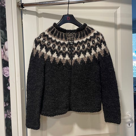 Neuletakki islantilaisesta Alafosslopi-langasta. Koko S/M.