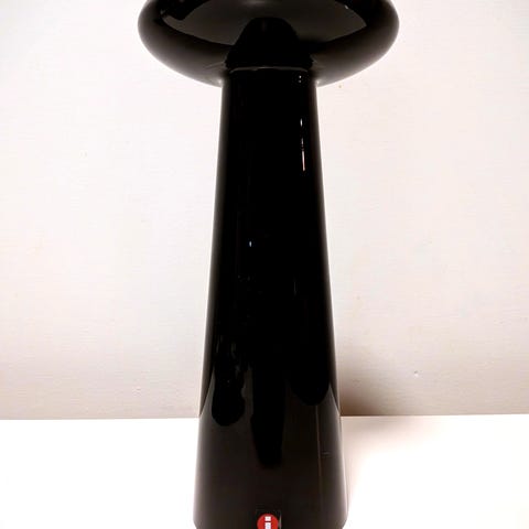 Tämä on Harri Koskisen Iittalalle suunnittelema musta Atlas-kynttilänjalka. Se on suupuhallettua lasia.